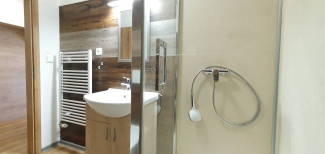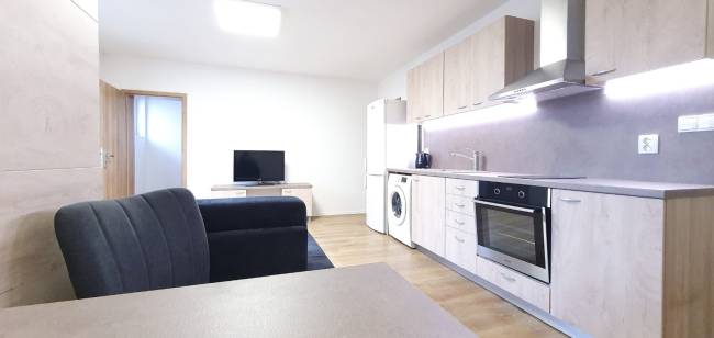 Vybavenie bytu: • kuchynská linka so spotrebičmi: elektrická rúra, varná doska, mikrovlnná rúra, rýchlovarná kanvica, automatická práčka, chladnička s mrazničkou, • jedálenský stôl so stoličkami, • obývacia časť s rozkladacím gaučom, šatníkovou skriňou, komodou a TV, • chodba s vešiakovou stenou, • murovaná kúpeľňa so sprchovým kútom a WC, • komora s úložným priestorom na potraviny, • bezpečnostné vstupné dvere.