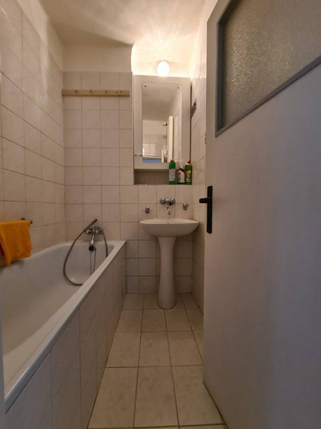 Kúpeľňa je murovaná s vaňou a murovaným samostatným WC. V celom byte sú vyššie stropy ako je štandard. Vstupná chodba a miestnosti sú priestranné, dve miestnosti sú prechodné, ale nemusia byť, pretože samostatný vstup je aj z chodby (takže stačí zamurovať prechodnú jednu časť medzi izbami). Čo sa týka stavu bytu tak boli v roku 2018 menené plastové okná v celom byte, plus žalúzie a sieťky proti hmyzu. Koncom roka 2025 sa robili nové stierky a maľovalo sa na bielo + v dvoch izbách sa menili nové laminátové podlahy, zachovali sa však aj pôvodné drevené parkety v izbách. Odstránila sa pôvodná kuchynská linka. Vonkajšie bytové dvere sa menili taktiež koncom roku 2025. Byt je inak v pôvodnom (rozvody elektriky, odpadu, vody pôvodná kúpeľňa a WC, interiérové dvere) stave, ktorý je čistý, udržiavaný a byt pôsobí veľmi dobrým svetlým dojmom. Nábytok, ktorý sa nachádza v byte môže ostať, prípadne sa byt vyprace - je to na dohode.
