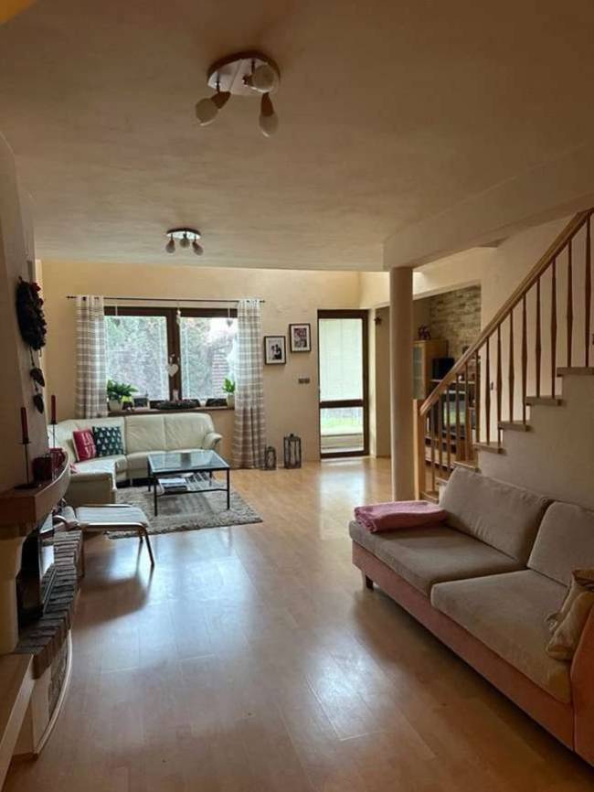 Prízemie: - Obývacia izba s krbom a podlahovým kúrením - Pracovňa - Technická miestnosť - Kúpeľňa so sprchovým kútom, WC a umývadlom - Dve miestnosti využiteľné ako pivnica či úložné priestory