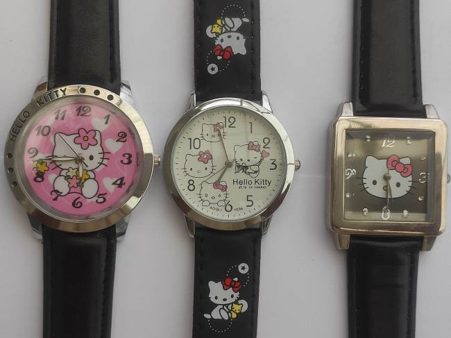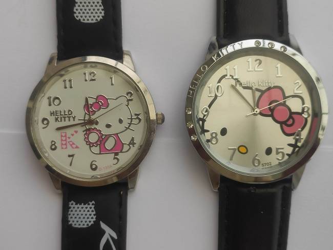 Predám elegantné Hello Kitty hodinky pre slečny a dámy v čiernej farbe. Tradičný aj netradičný tvar ciferníka obsahuje rôzne obrazce Hello Kitty vo vnútri ciferníka. Ciferník zdobený lesklými kamienkami. Remienok čierny a zdobený dĺžky 23,5 cm je nastaviteľný aj na iný rozmer, cena už od 3 € !