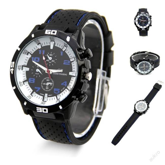 Pánske elegantné športové náramkové hodinky z nerezovej ocele Grand Touring sú určené pre elegantných mužov, ktorí zároveň preferujú športový a aktívny štýl. Quartz strojček, kvalitný silikónový zdobený remienok s príjemnou povrchovou úpravou SilkTouch dĺžky 24,5 cm s farebným vzorom na kraji remienka ladí s farebne značeným číselníkom v ciferníku priemeru 2,2 cm. Remienok má klasické upínanie cez kovovú sponu, pomocou dierok si potom môžete zvoliť, aká dĺžka opasku vám vyhovuje najviac. Tvrdené minerálne sklíčko. Japonský quartz strojček. Vhodné pre každodenné použitie pri rôznych voľnočasových a vnútorných aktivitách, ako sú obchodné rokovania, večierky, nákupy atď. Je to perfektný darček k narodeninám pre priateľov, kolegov alebo otcov. Dostupné farby: červená, žltá, zelená, bielo-modrá Priemer ciferníka: 4,3 cm Šírka remienka: 2,1 cm a dĺžka remienka: 24,5 cm Váha 50 g